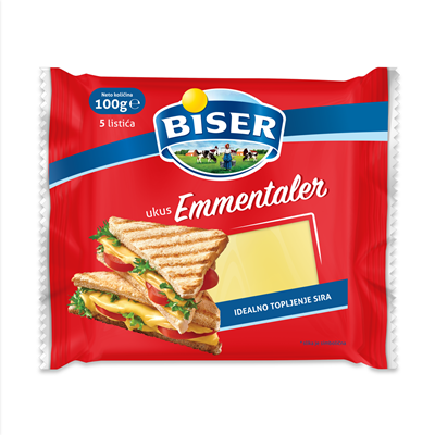 BISER listići topljenog sira. Ukus emmentaler. Pakovanje ima 5 listića, 100 g.