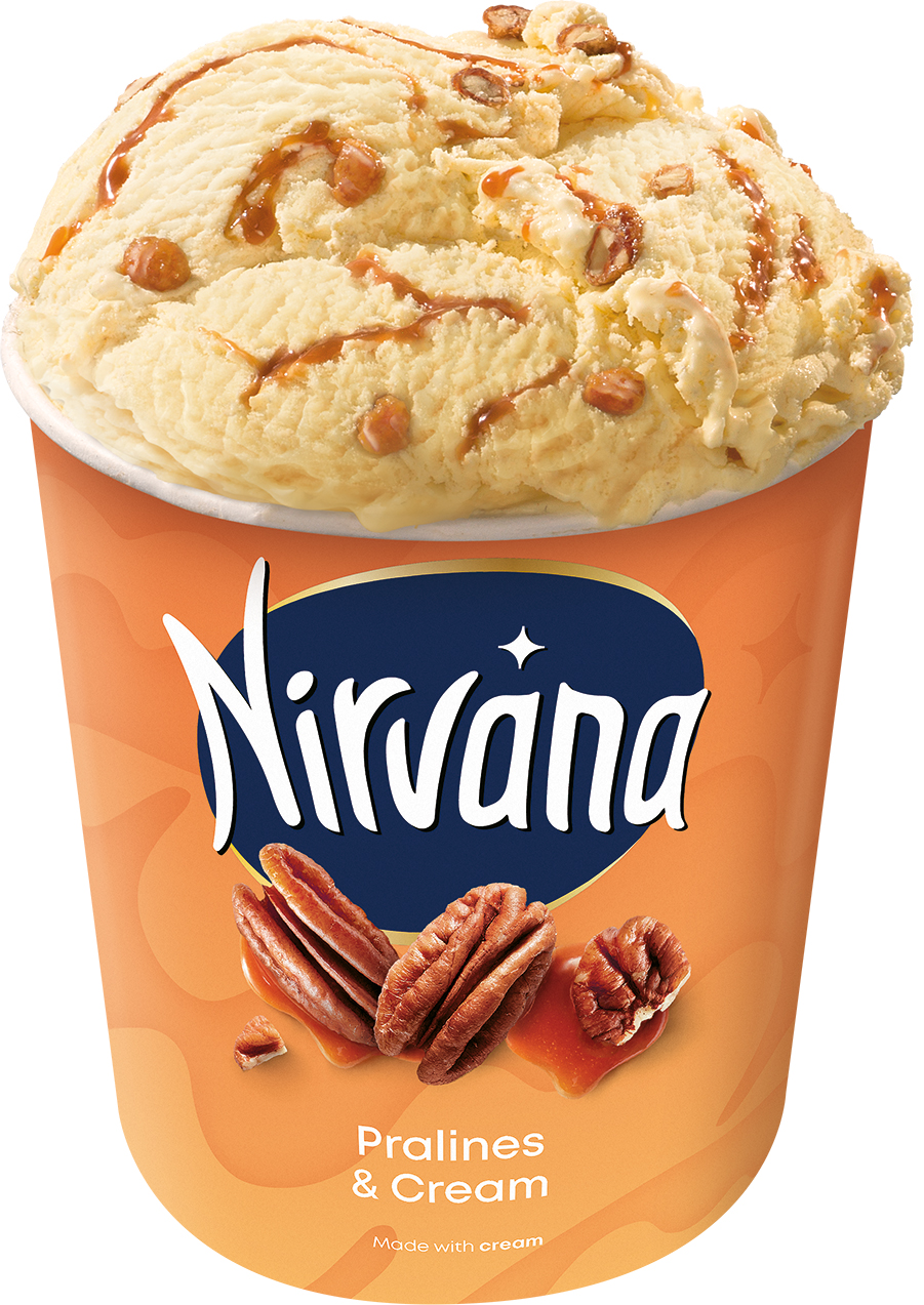 Premium caramel ice cream with caramel syrup with caramelized pecan walnuts