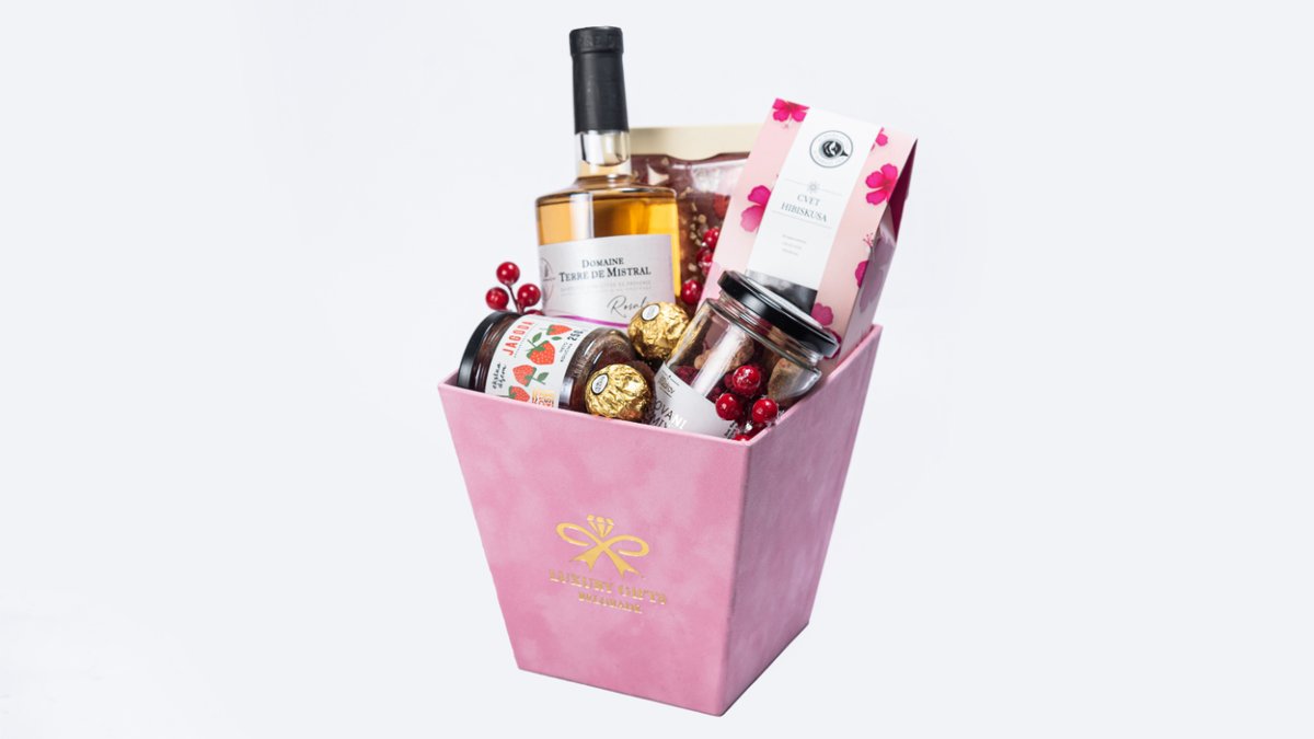 Kutija u plišu, Domaine Terre De Mistral Rosalie, Premier Rubi Cokolada, Cvet Hibiskusa – Caj, Dunst Dzem Jagoda, Lio Pozdrav Liofilizovani vocni mix, Rinfuza, Dekoracija, Celofan i Mašna